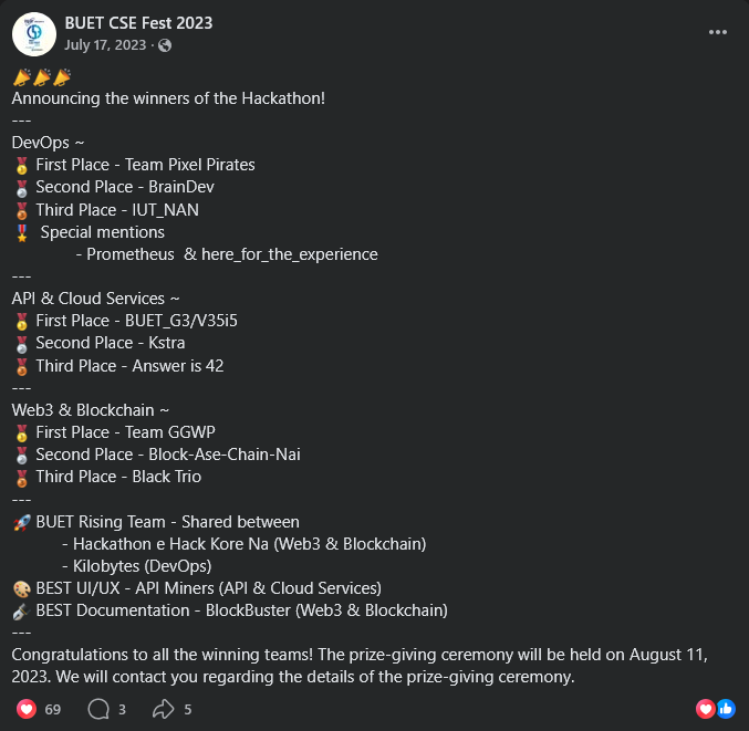 Official coverage: MIST — MIST hosted World Telecommunication and Information Society Day Hackathon-2025 for Schools, Colleges and Universities (posted 25 May 2025) — “Team Oscillating/Pandas from BUET secured 1st place.”