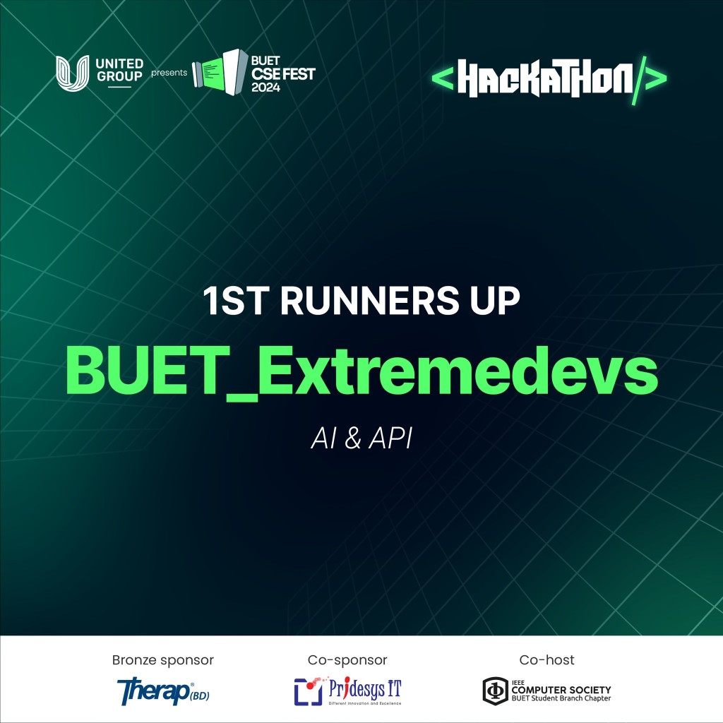 1st runner-up (AI & API track), BUET CSE Fest Hackathon 2025 — team BUET_Extremedevs (AI powered Trip Planner)