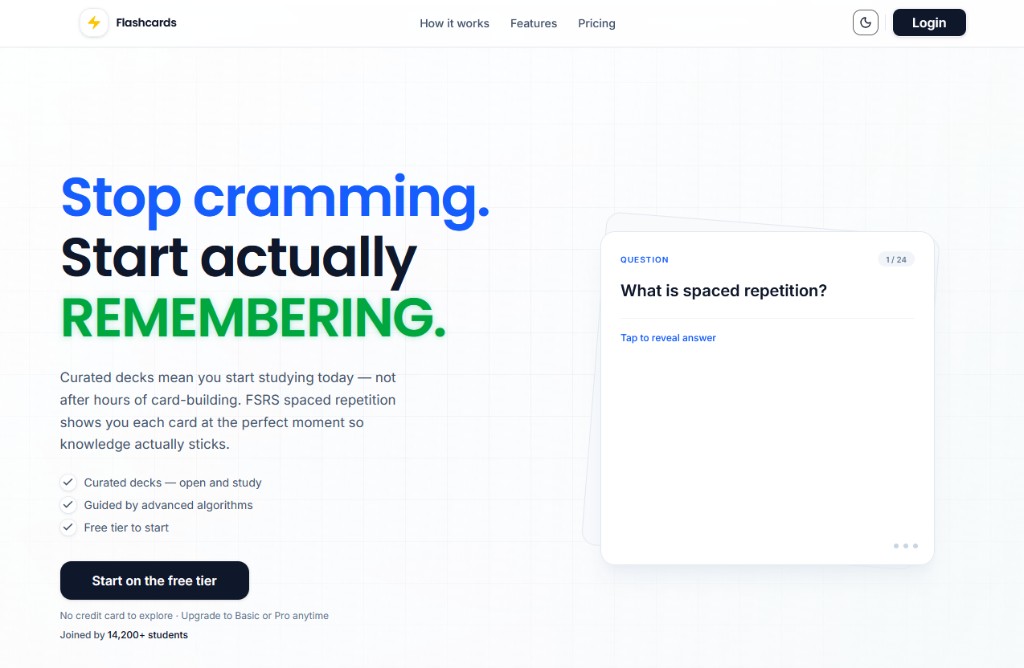 Flashcards — curated decks and FSRS spaced repetition so you study effectively without spending hours building cards. Free tier to start.