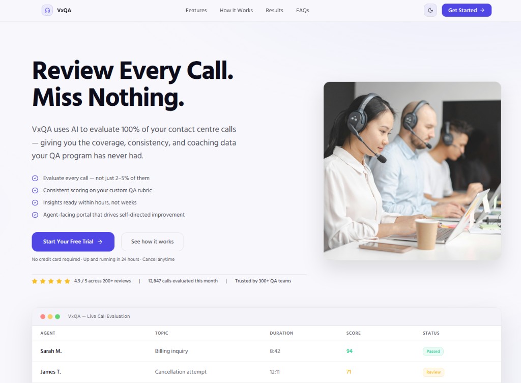 AI call QA for contact centers — evaluates 100% of calls (not a 2–5% sample) with consistent scoring on your rubric, coaching-ready insights in hours, and an agent-facing portal for self-directed improvement.